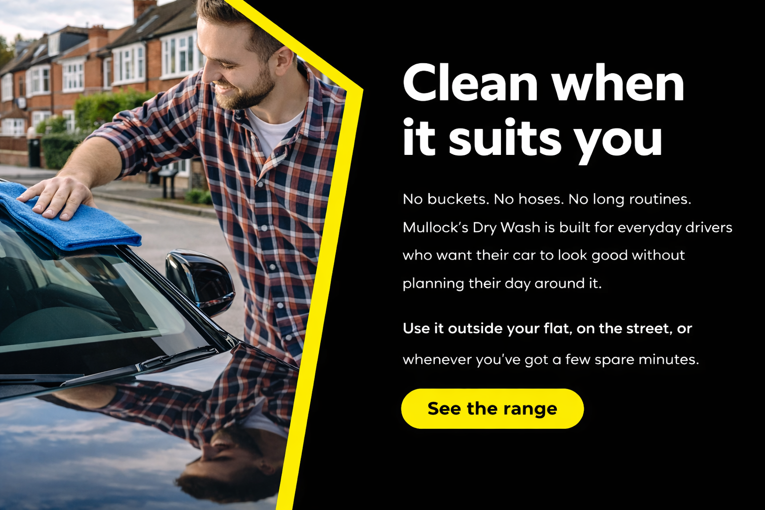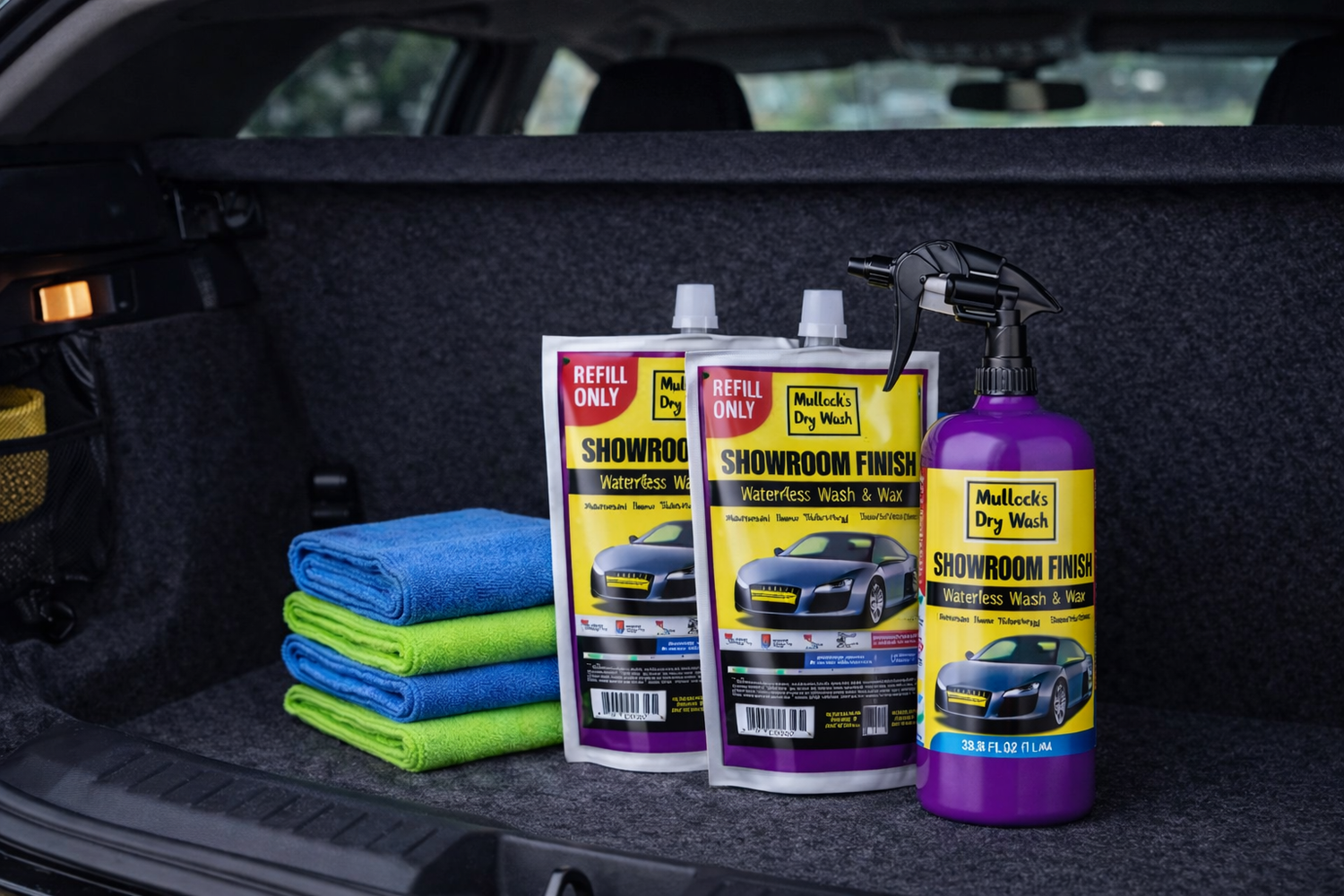 Mullock’s Dry Wash is made for people who don’t have access to a hose or driveway. If you live in a flat, park on the street, or just want a quicker way to keep your car looking clean, this is for you. Simply spray on, wipe off, and enjoy a clean, protected finish anywhere, anytime, with no water required.